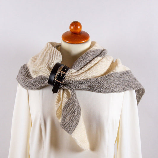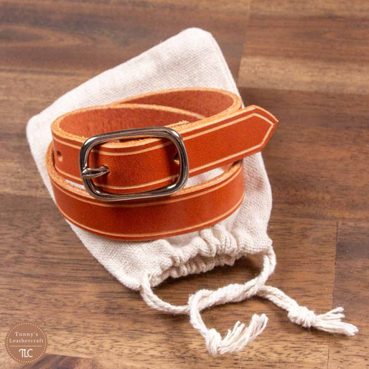 Håndlaget sjalmansjett i ekte lær – lys brun med pyntestripe og messingfarget spenne